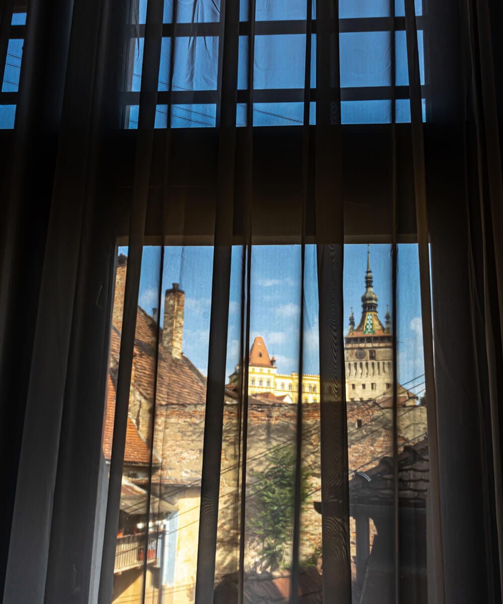 Patul dublu, îmbrăcat în lenjerii albe imaculate, devine un sanctuar în care serile se transformă în povești în șoaptă, iar diminețile în începuturi blânde. Fie că citești, savurezi un ceai sau o cafea, ori pur și simplu îți lași gândurile să se plimbe, camera oferă cadrul perfect pentru momente de pauză și introspecție.